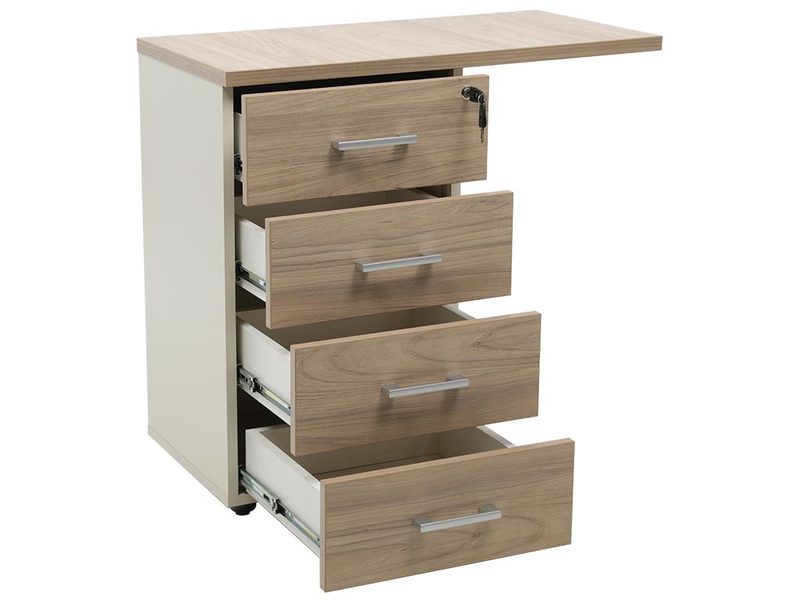 - тумба снабжена центральным замком и оснащена пластмассовым лотком для канцелярских принадлежностей в верхнем ящике